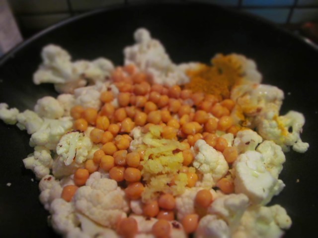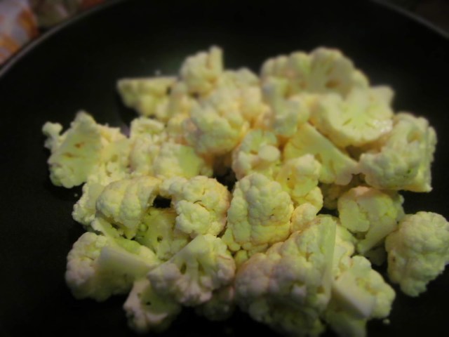 - Розичките карфиол сложих в загрят и намазан с олиото уок. Запичах по този начин /трудно се пържи с толкова малко олио/ около 5 минути като бърках от време на време