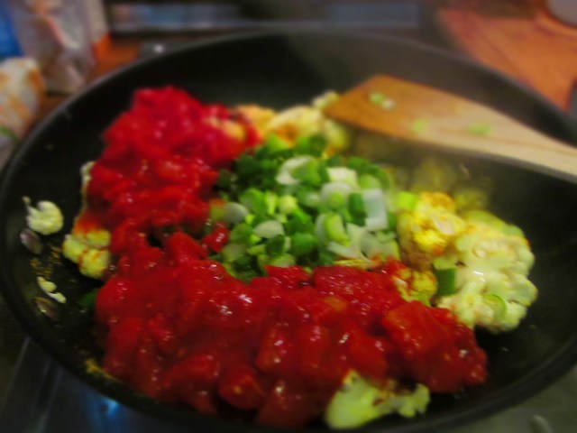 - Добавих зеления лук, подправките и нарязаните на ситно домати /може и от консерва/.