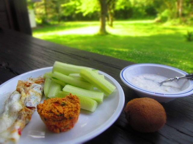 За омлета вече съм писала не един път, така че няма отново да Ви занимавам. Домата прибавих към омлета. От изварата, сварените овесени ядки и лешника направих каша. Кивито беше за десерт. Маслините бях забравила за снимката. Добавих ги после, за да си изравня блоковете.