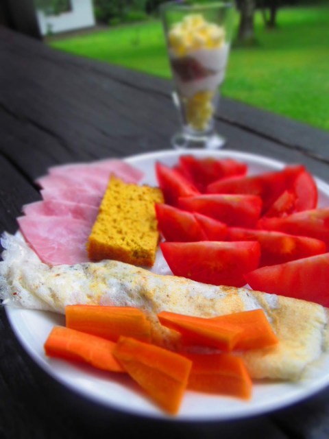 От белтъците и сиренето направих омлет и олиото /вече знаете, че много го обичам/. Гарнитурата му бяха хлебчето, доматите, маслините и моркова. От скира, лешниците и ябълката си направих вкусно кремче за десерт.