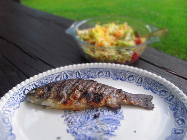 От зеленчуците направих салата, която овкусих с 1/3 от зехтина и оцета. С останалата мазнина намазах рибата, преди да сложа на скарата.