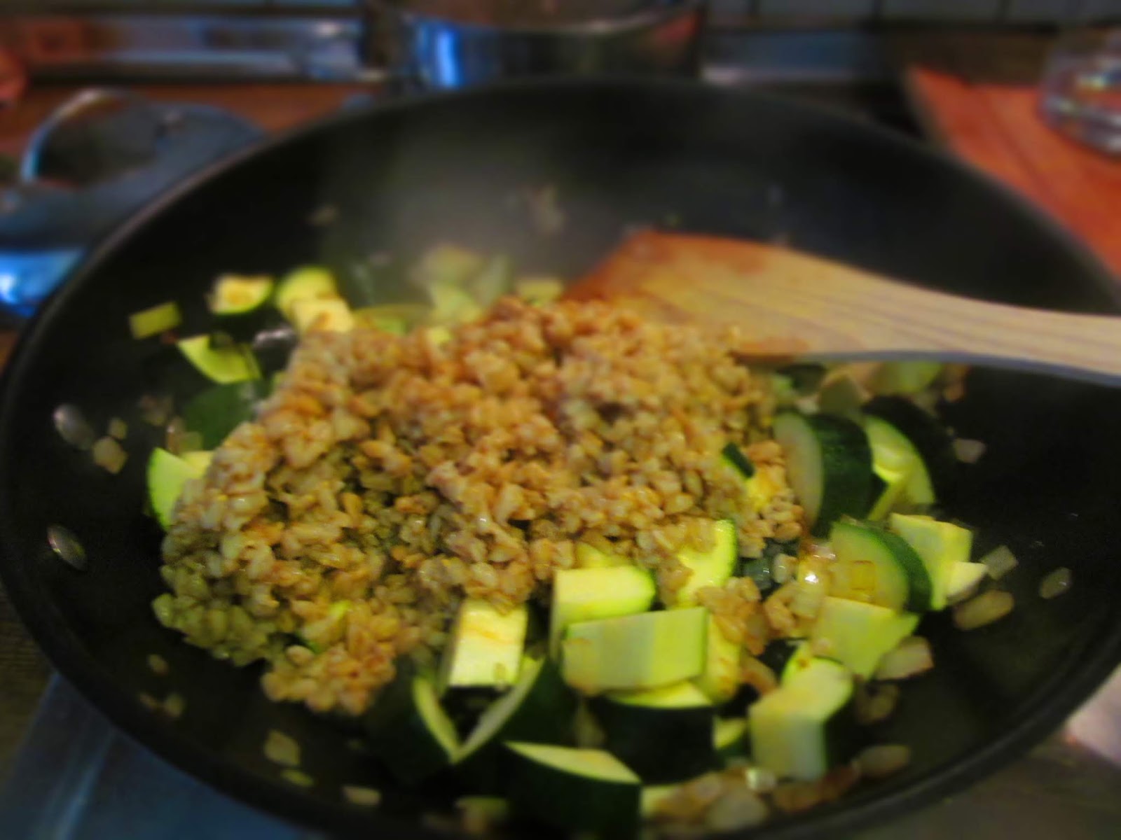 Добавих тиквичките и хубаво разбърках.
