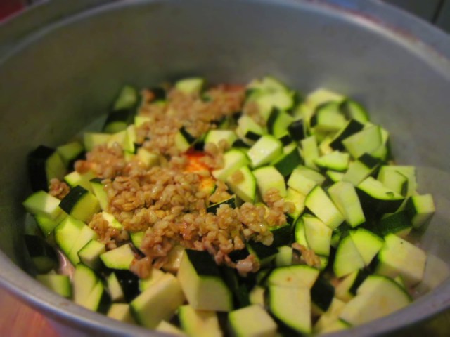 • На дъното на тава изсипах тиквичките и сварения овес.