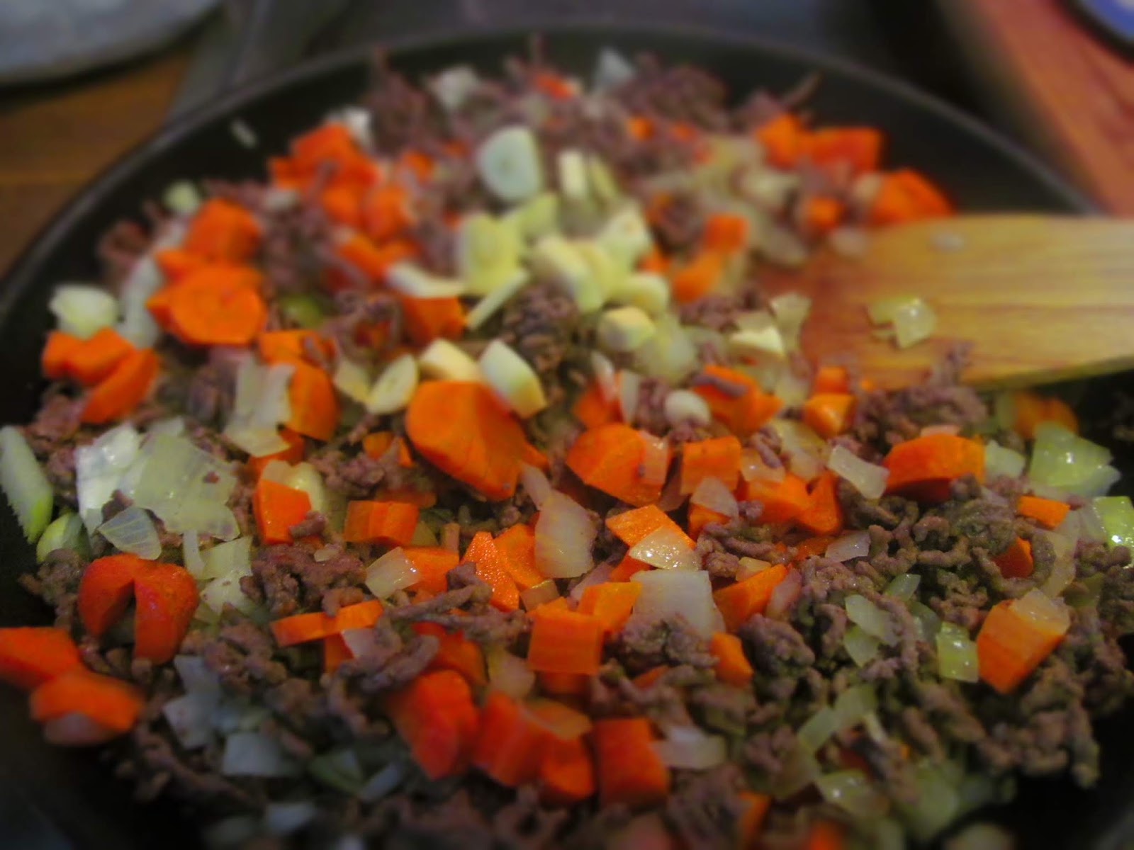 • Добавих кромидия лук, морковите и чесъна, нарязан на ситно. Разбърках и пържих до леко омекване на морковите.