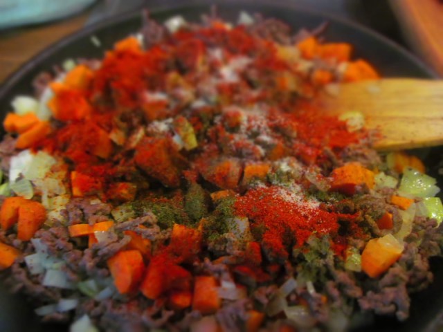 •  Изсипах каймата, добавих още сушен магданоз и разбърках.