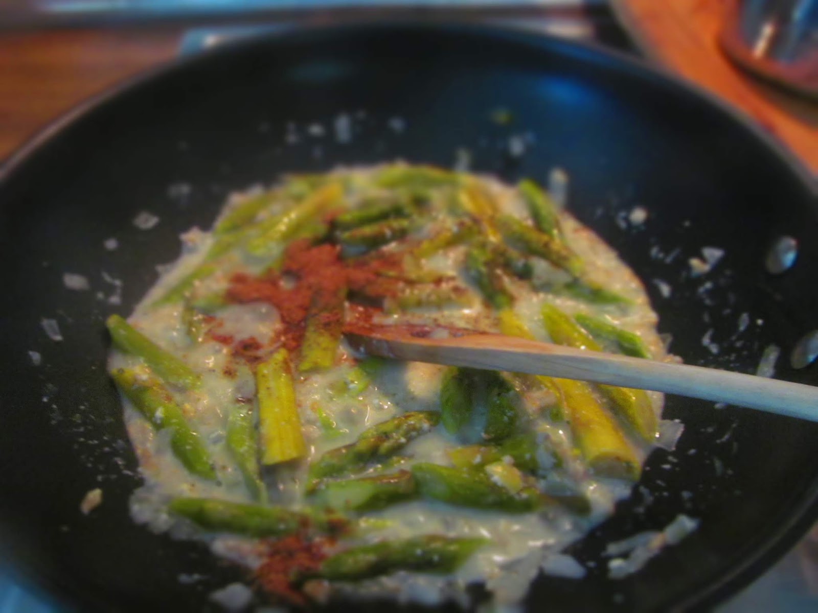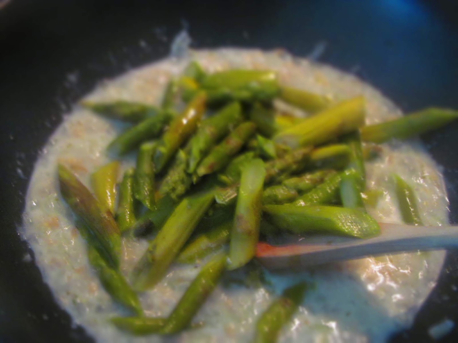 Добавих сварените и нарязани на едро аспержи. Задуших още 5 минути.