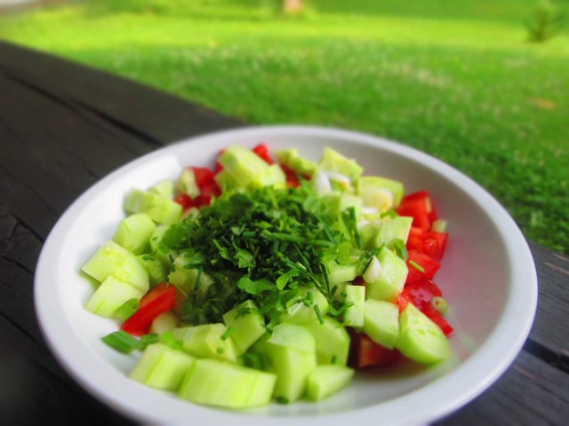 От краставиците, доматите, зехтина и зеления лук направих салата.