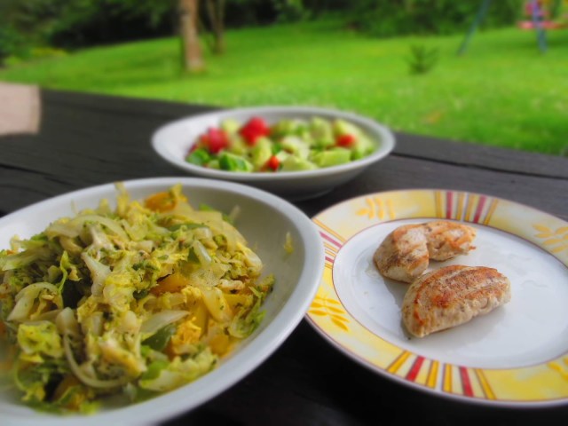 Обядът беше в кутия и приготвен още в четвъртък. Савойско зеле с чушки и лук. Подробности за него ще прочетете ето тук. Запълних протеиновите блокове със 84 гр скумрия на скара от петък вечерта, 3 ореха и 50 гр круша.