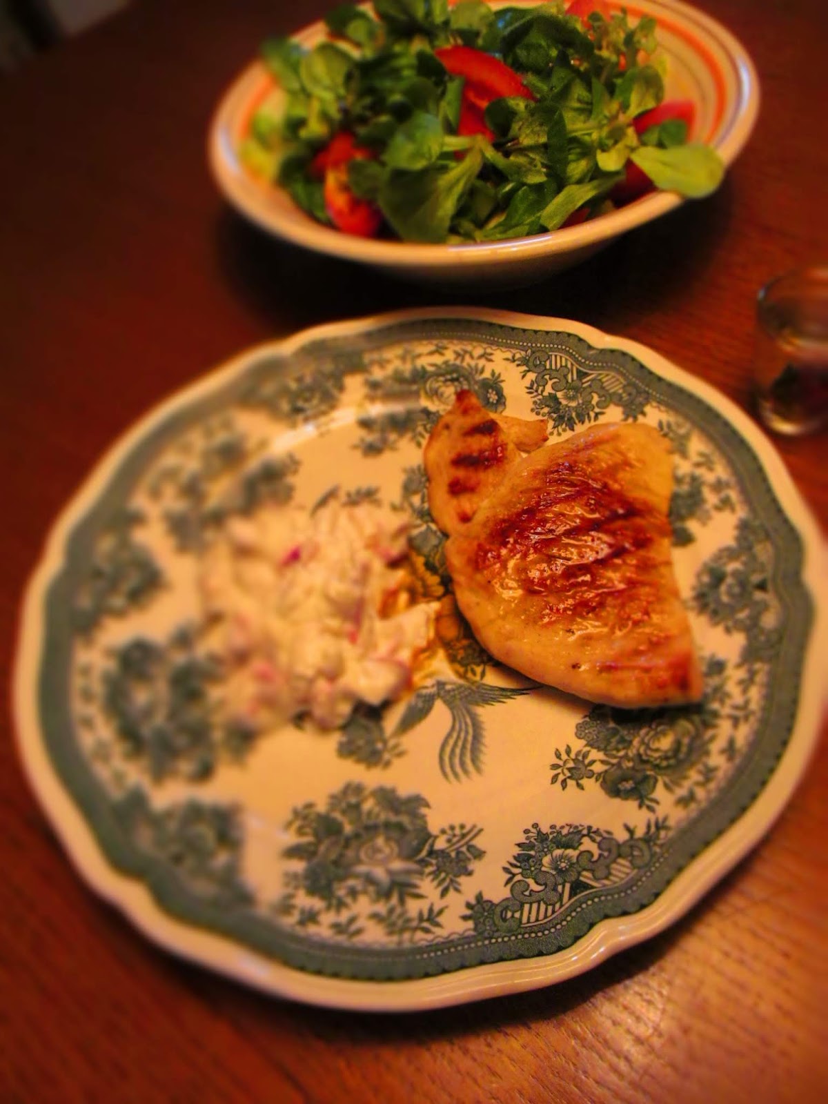 Набързо приготвен пуешки шницел на грил тиган със сух таратор и салата.