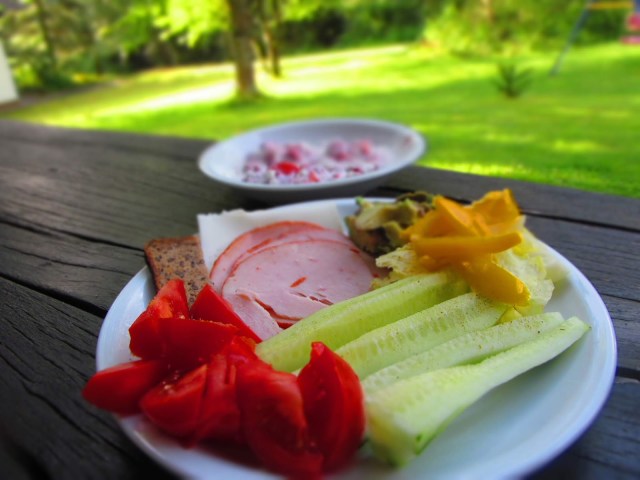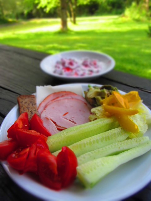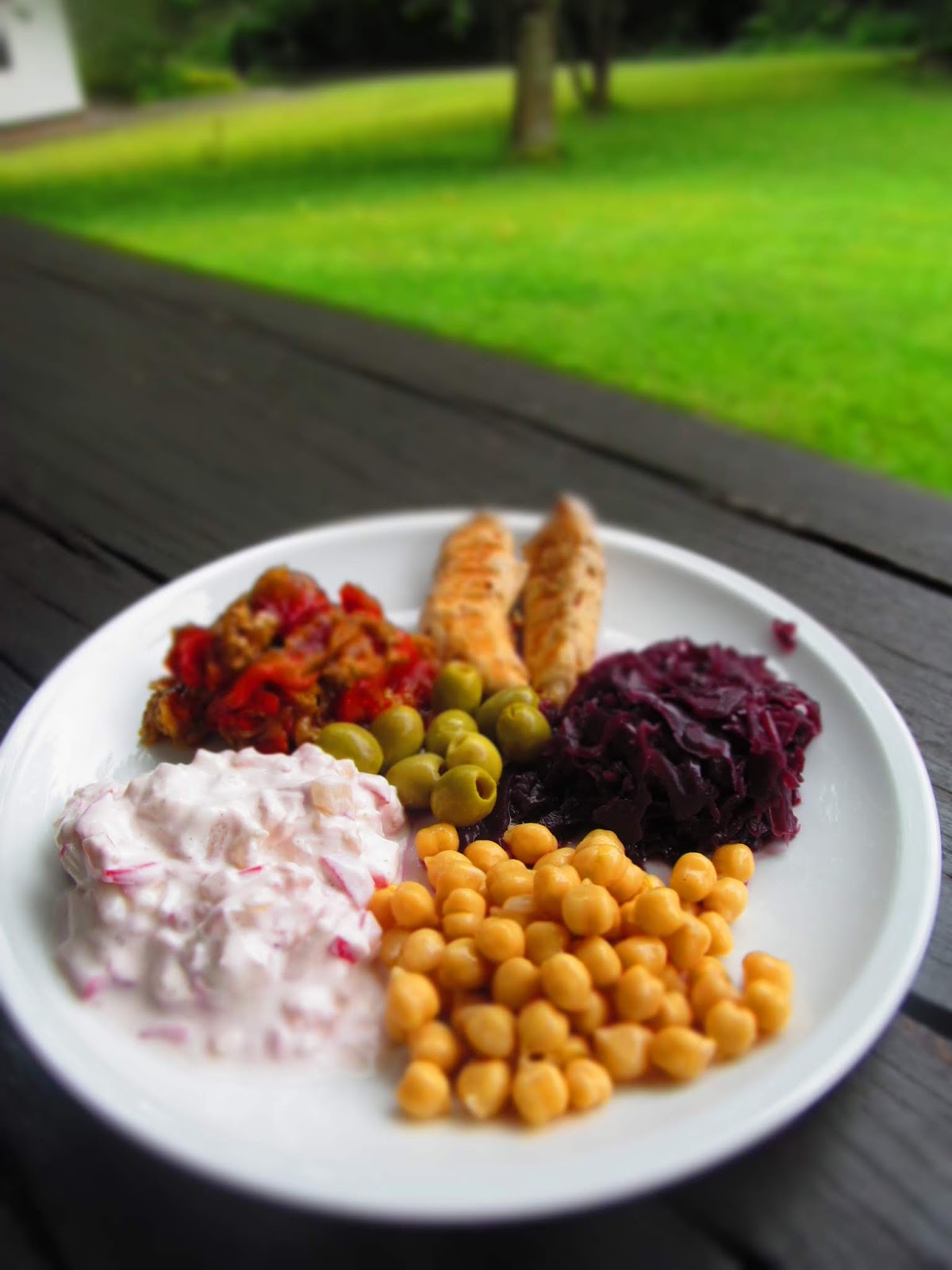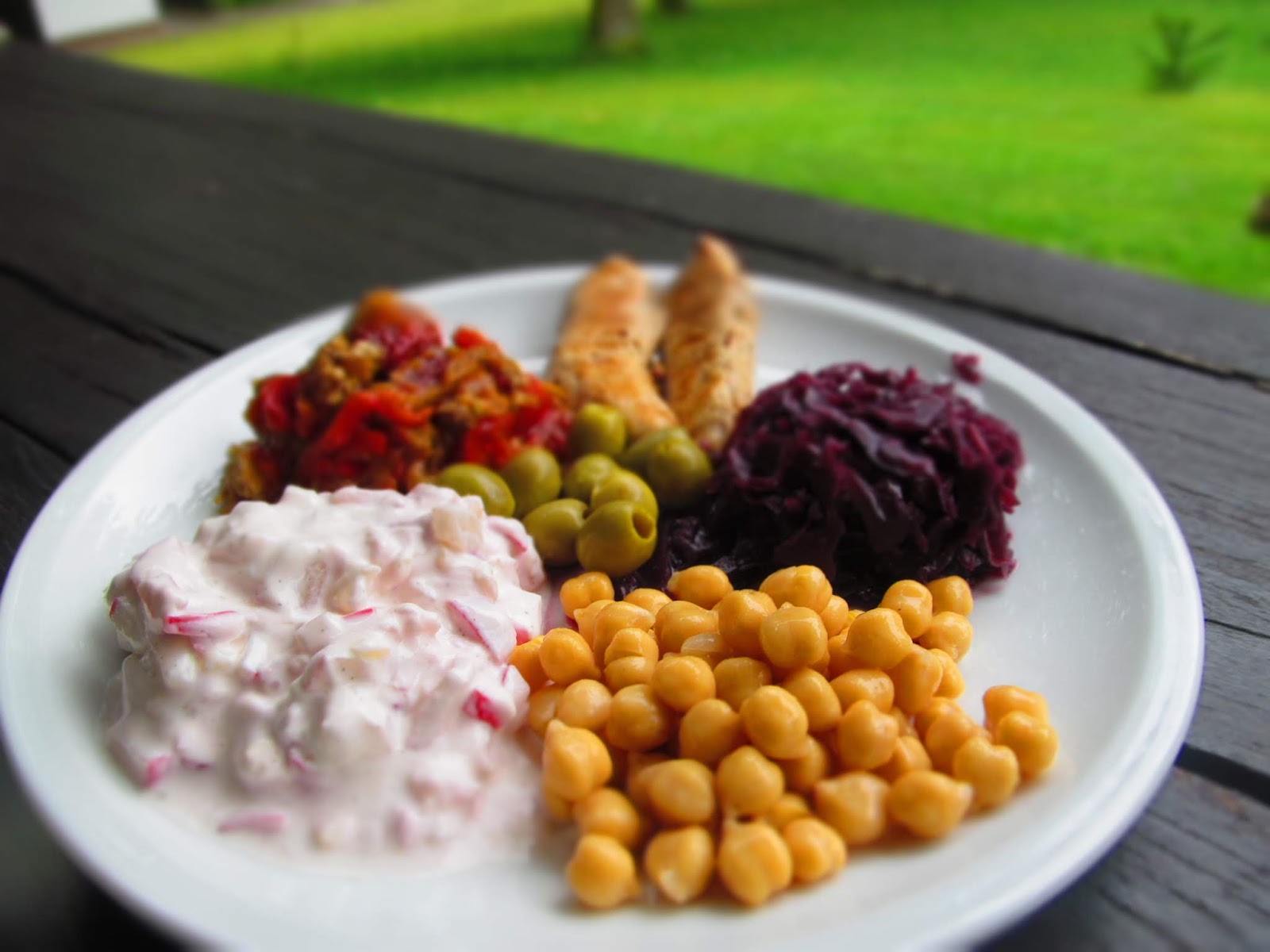 И сега за срядата. Опитвам се от време на време да поразчистя това, което съм приготвяла в предишните дни и не съм успяла да похапна. Така се получават едни шарени чинийки от неща, които дори взаимно се отричат. На мен, обаче си ми харесват тези дни на почистване на хладилника. Още повече, че после предстоят дни на новостите. Купувам зеленчук, който още не съм похапвала в зоната, или пък някакъв нов вид риба, месо и т. н.