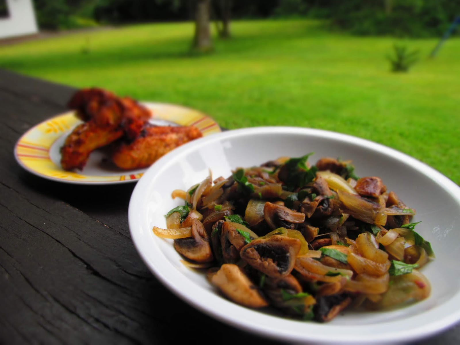 Тиганче с гъби и лук, и пилешки крилца на скара, но за мен без кожата.