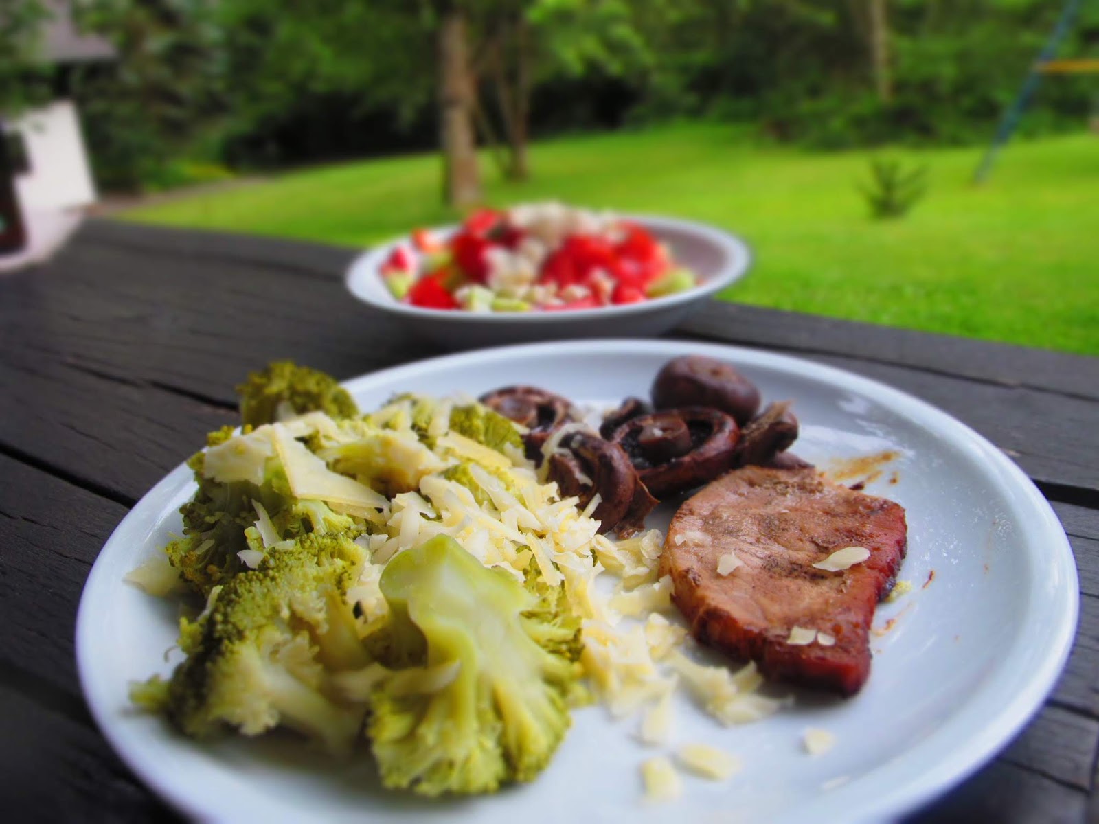 Вечерята беше приготвена от моя съпруг – свински филенца с гъби в йенската тенджера с добавката на малко водичка и само 1 ч. л. мазнина. Готовото ястие само измерих за моята чинийка. Запълних блоковете със сварено броколи, поръсено с настърган кашкавал и 1БПВМ шопска салата.