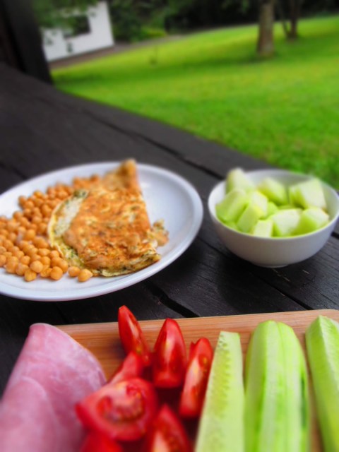 Омлет и пъпеш по Бари Сиърс с добавка на домат, краставица и шунка за запълване на блоковете.