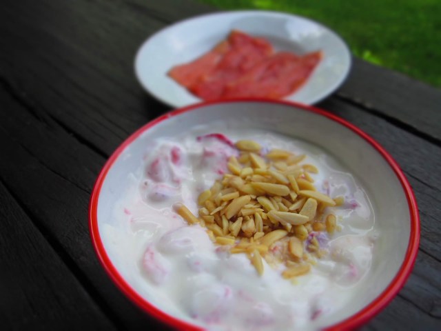 Киселото мляко и ягодите смесвам и поръсвам с бадемите. Бекона изпържвам в сух тефлонов тиган до хрупкав.