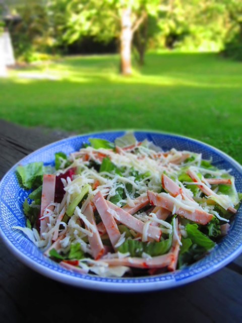 Смесвам зеленчуците в купа, овкусявам с дресинга, разбърквам. Върху тях подреждам нарязаните на ситно шунка и пилешко филе. Поръсвам с настъргания кашкавал.