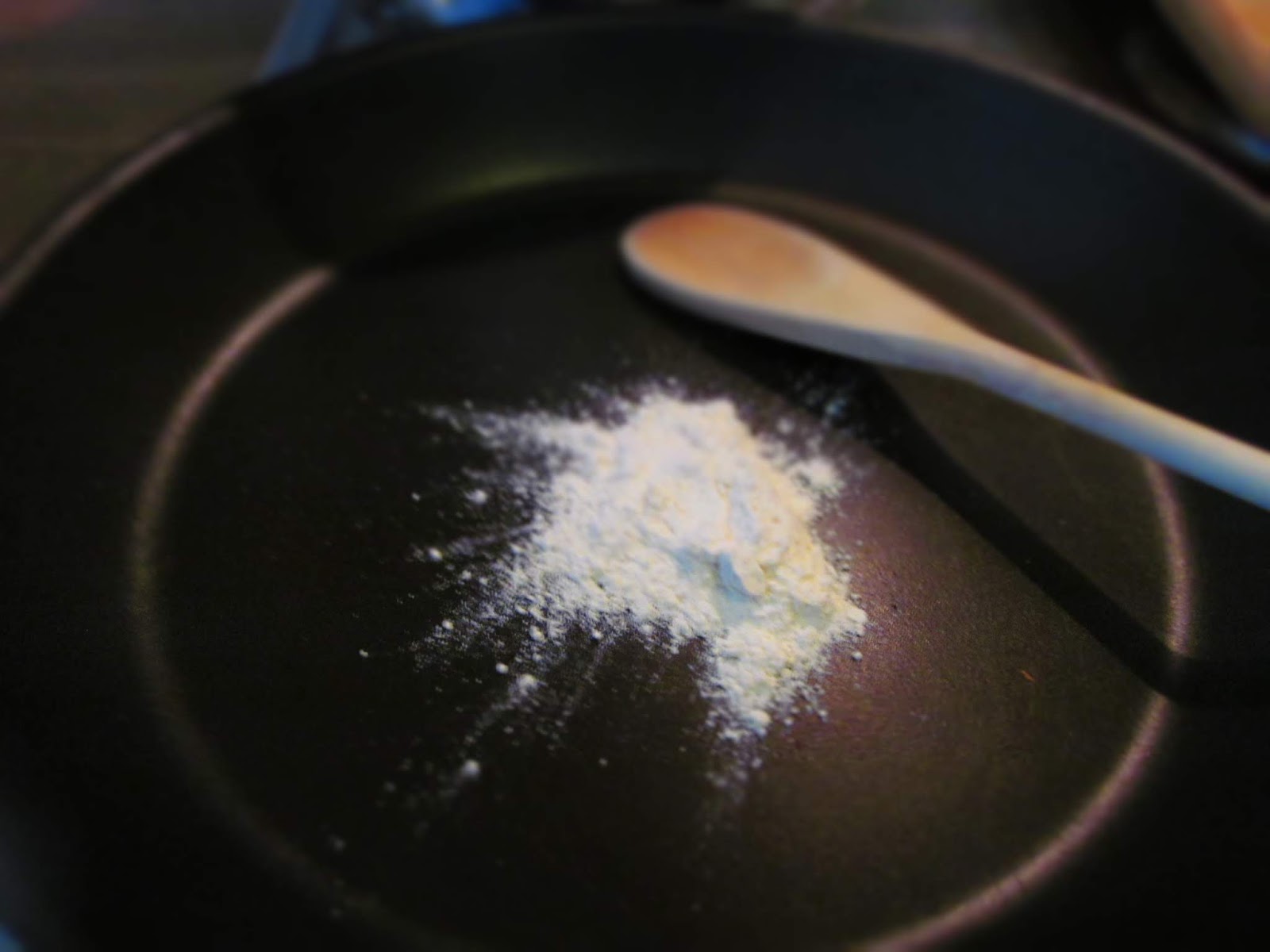 - През това време запичам брашното в сух тиган до леко потъмняване.