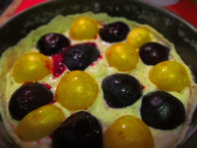 - Върху крема подредих измитите, разполовени и почистени от костилките сливи.