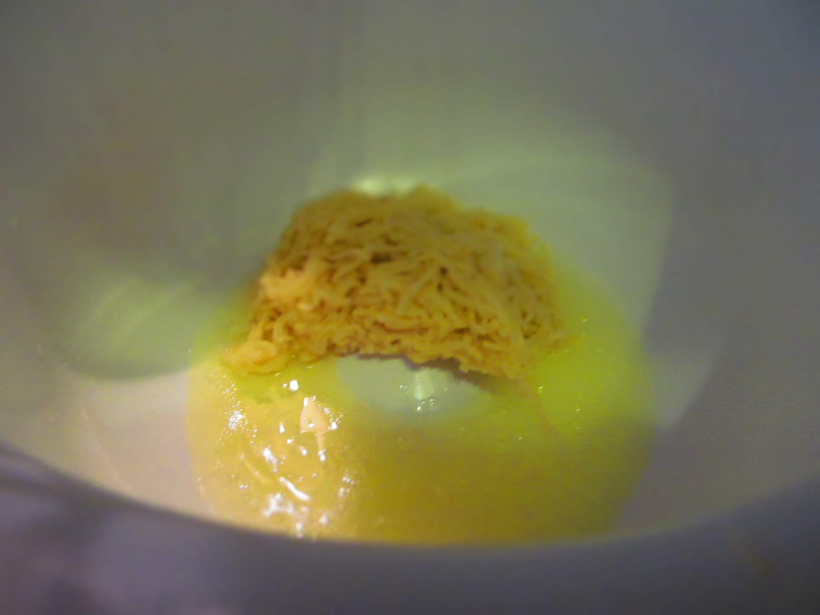 - Разбих двата белтъка само до пяна и добавих половината от настъргания марципан. През цялото време миксерът ми е на максимална мощност.