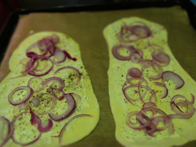• Четвъртинката тесто, което съм определила за този Фламкухен разделям на две части, които разточвам на две горе – долу продълговати кори. Не се старайте да са еднакви и красиви. Ще се изяде и без да е разточено тестото като за изложба.