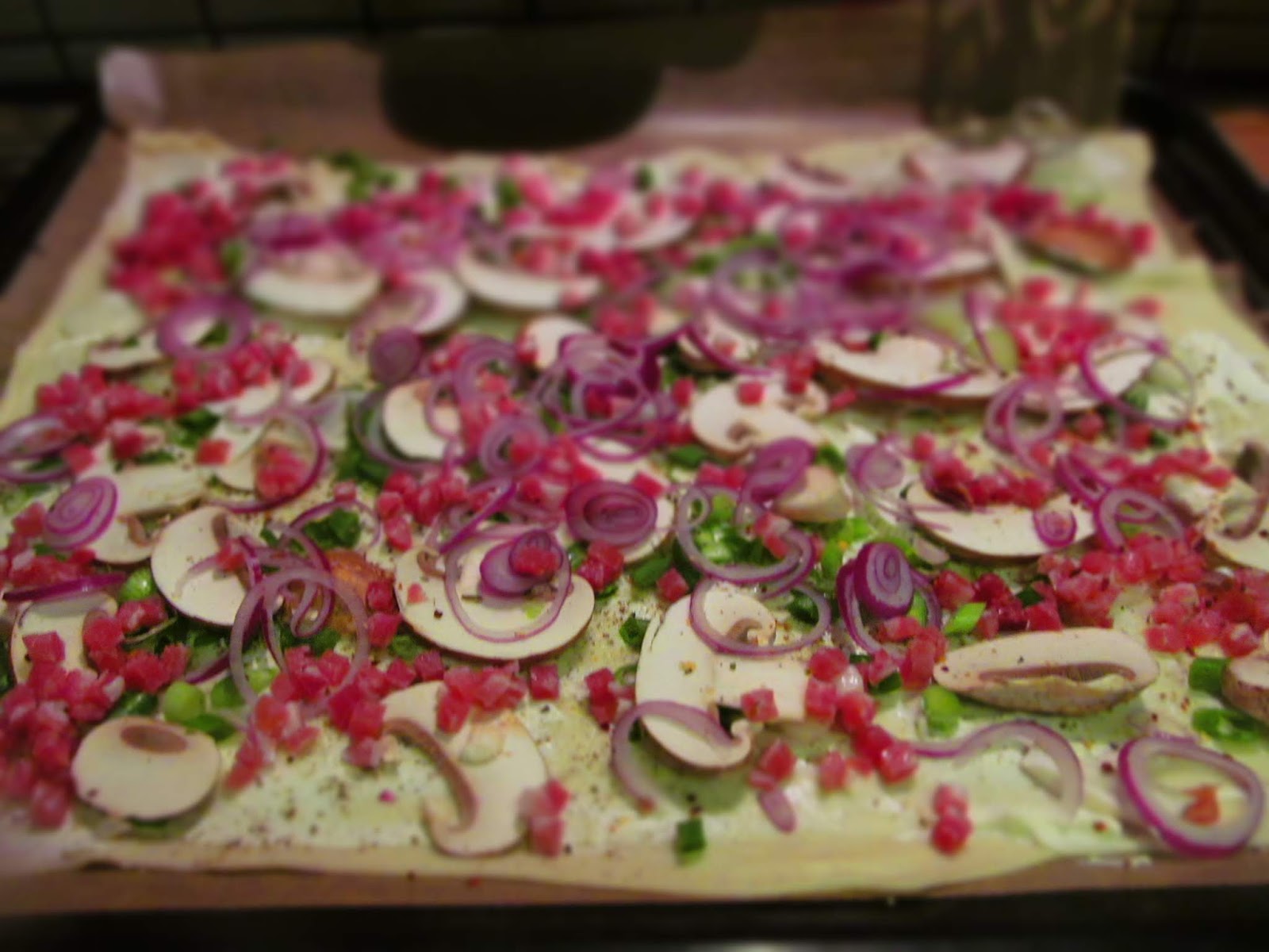 Нашата вечер на Фламкухена беше в работен ден. И след 8 часа работа се сещате колко сме гладни и как не се чака много, много за вечерята. Аз обаче се изхитрих. Купих една доза готово тесто за Фламкухен. В Германия то се продава във всеки магазин наравно с тестото за пица, бутер тестото и корите за баници /щрудел/. И докато втаса моето тесто – от готовото тесто направих първия Фламкухен за мезе на виното и за залъгване на глада. И така за час и половина имахме готови 5 различни вида Фламкухен, бяха изпечени и изядени.