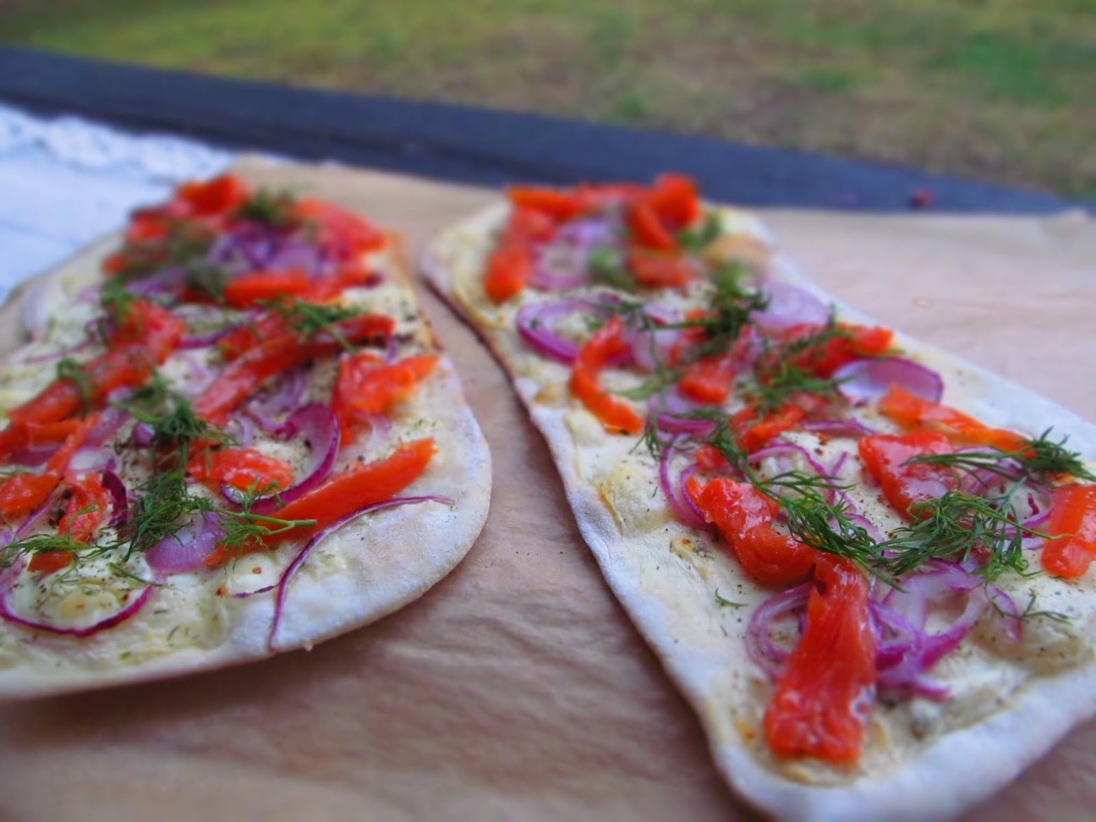 • Върху горещия Фламкухен накъсвам пушената сьомга и разпределям едро накъсания копър.