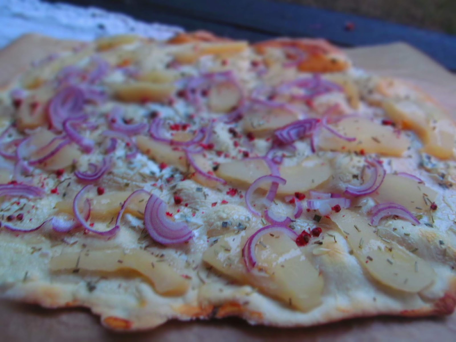 Днес искам да Ви покажа и няколко вкусни разновидности на Фламкухен. Добавката на гъби към Класика, или пък комбинацията на сьомга и копър, аншоа с домати и маслини, три вида сирена и чубрица /това е малко мой побългарен вариант/ и моят фаворит – вилямови круши, розмарин, козе сирене и вкусните розови зърна пипер или познати като бразилски пипер.