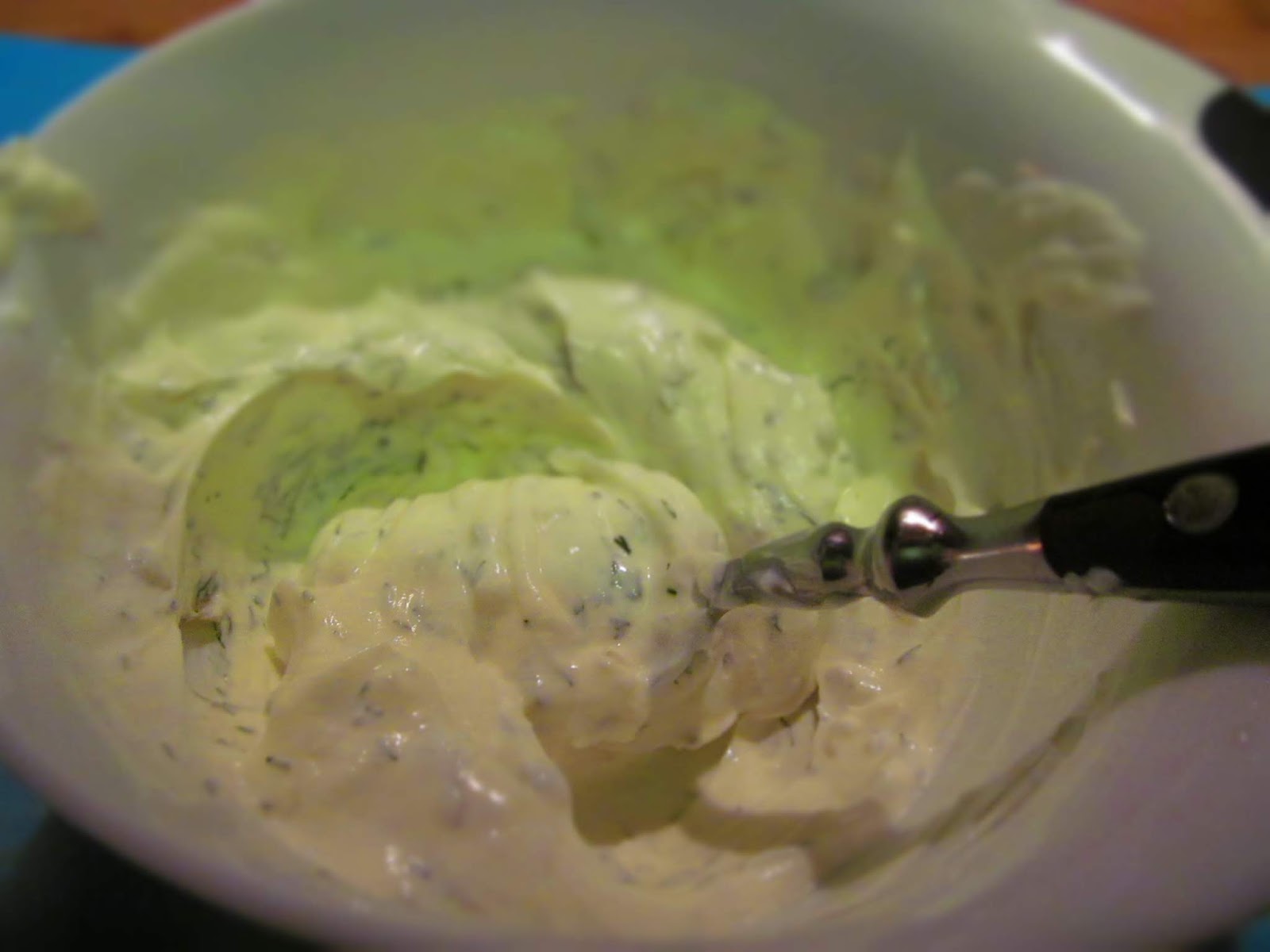 • За Фламкухен с пушена сьомга е нужно първо да смеся изварата и заквасената сметана. Подправям със сол, черен пипер, лют пипер, магданоз, копър и малко чесън по желание. Може да добавите вместо чесън малко хрян. Но това е въпрос на вкус.
