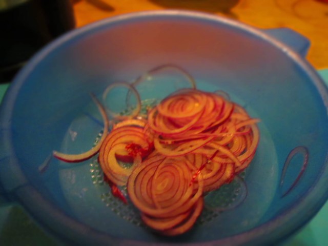 • Нарязания на много тънки филийки червен лук слагам в гевгир и заливам с вряла от бързоварната кана вода. Така лукът омеква бързо.