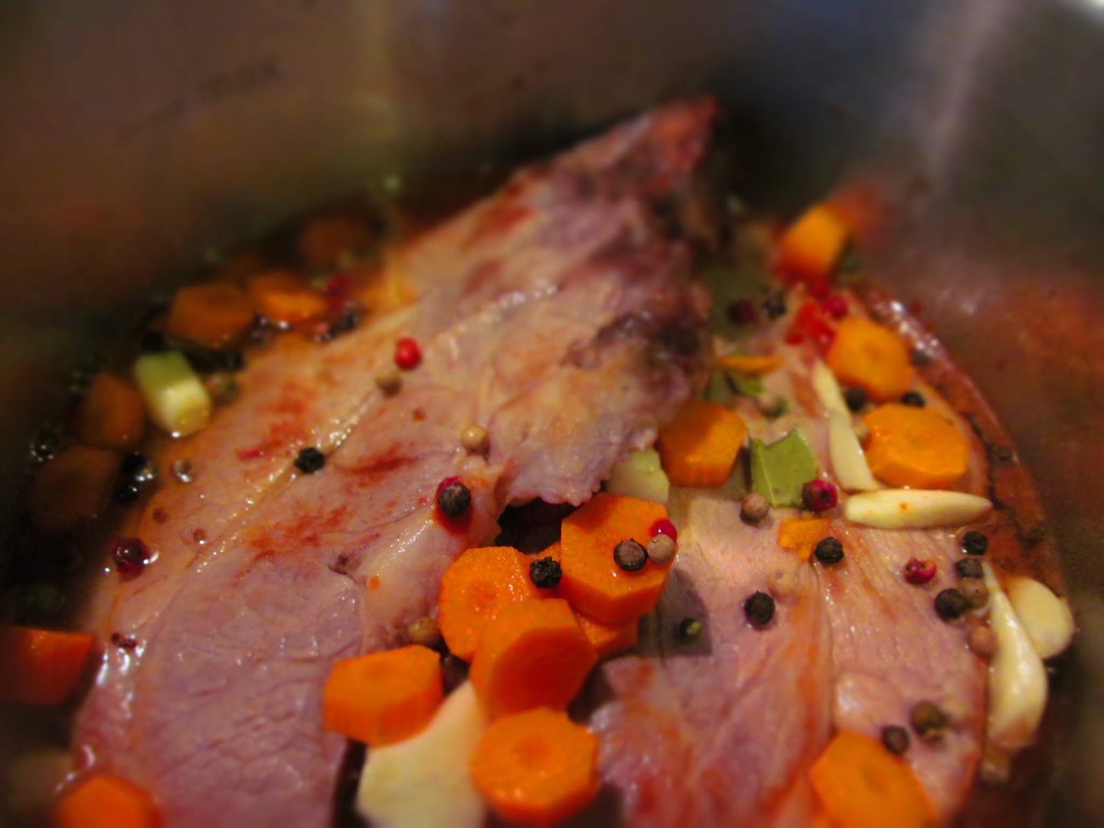 - Затворих тенджерата под налягане с капака и включих котлона на максимална мощност. Когато тенджерата зашумя, намалих на минимална мощност и засякох половин час.