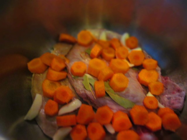 - Подредих първите две леко изпържени и от двете страни пържоли на дъното на тенджерата и върху тях нарязах на едро половината скилидки чесън и на кръгчета половината моркови. Начупих единия дафинов лист.