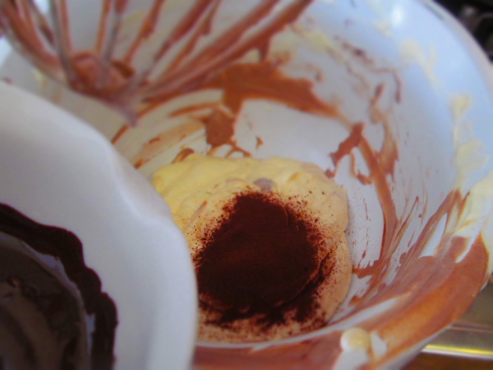- Към едната част добавих 1 ч. л. какао и разтопения, но не горещ млечен шоколад. Разбих на пухкав крем.