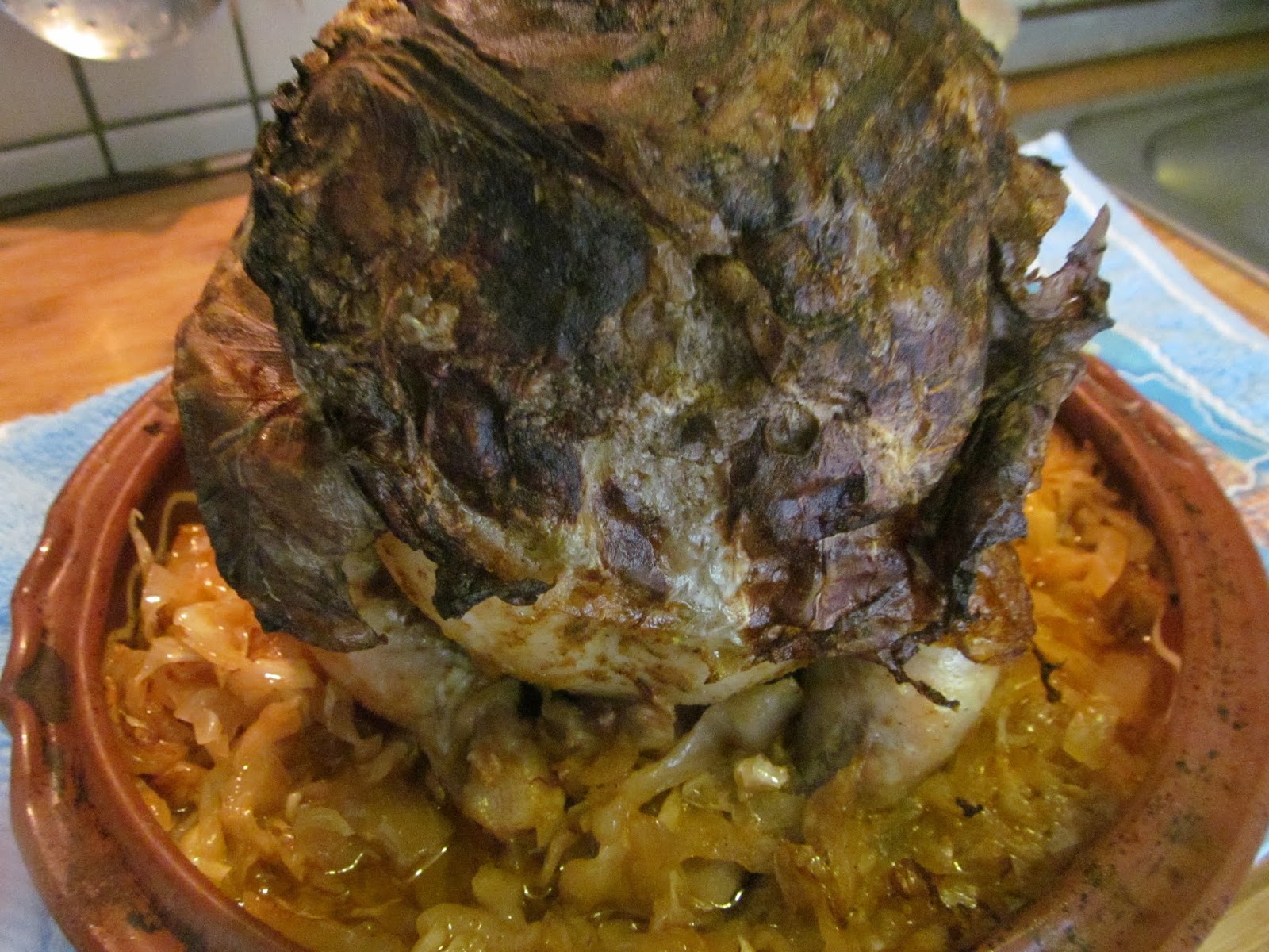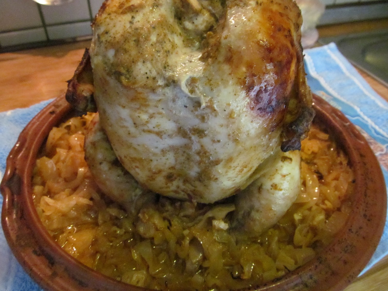 - След предвиденото време изваждам от фурната, махам листата от кисело зеле от пилето и връщам отново във фурната за още половин час.