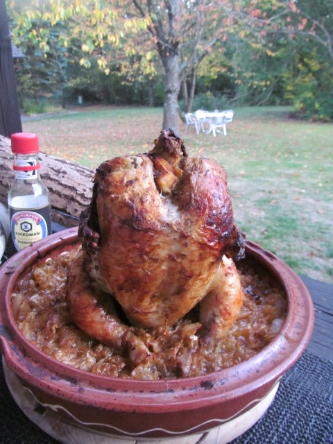 - Другата част разреждам с 300 мл бира и изсипвам в гърлото на специалния съд за пиле на шиш. Продава се във всички магазини за българска керамика.