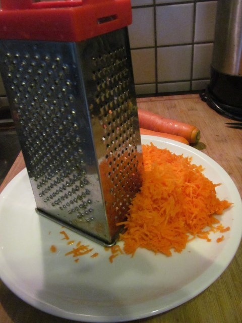 - Измивам, обелвам и настъргвам морковите на ситно ренде.