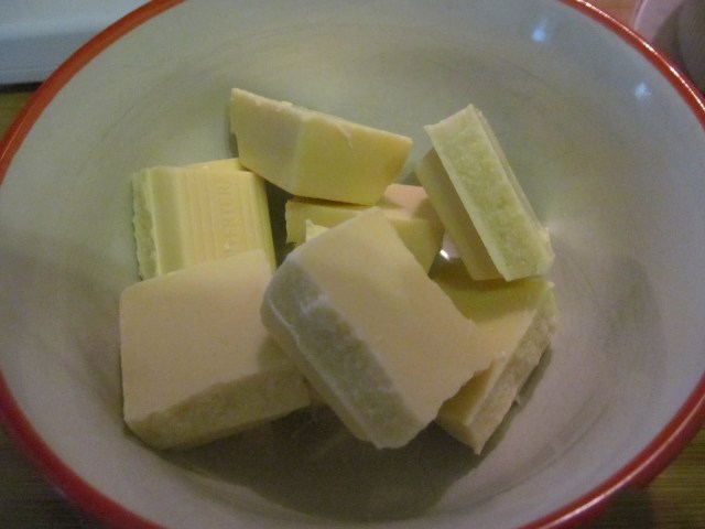 - През това време начупих белия шоколад в купичка и разтопих за кратко в микровълновата фурна.
