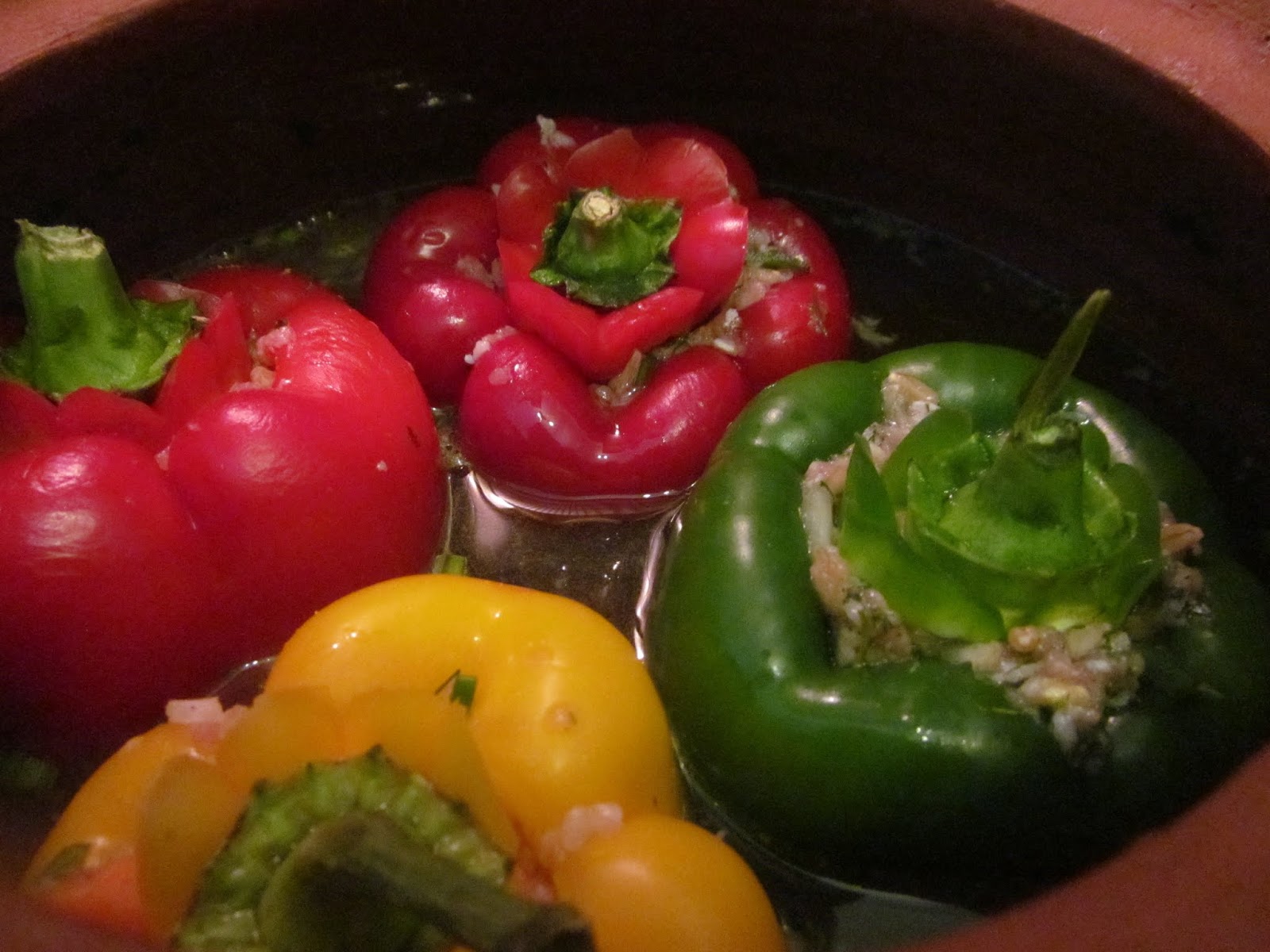 - Напълвам с тази смес четирите чушки, които предварително съм почистила от дръжките и семето. Дръжките запазвам за похлупачета на чушките.
