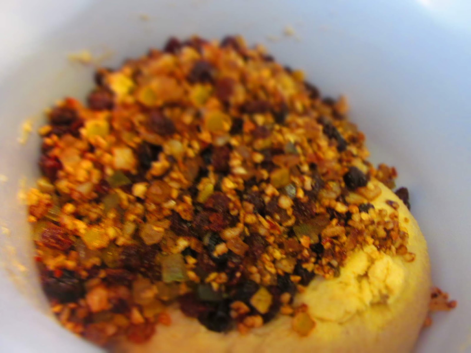 - В купа смесвам лешниците, корите от портокал, корите от лимон, стафидите, подправките и рома.