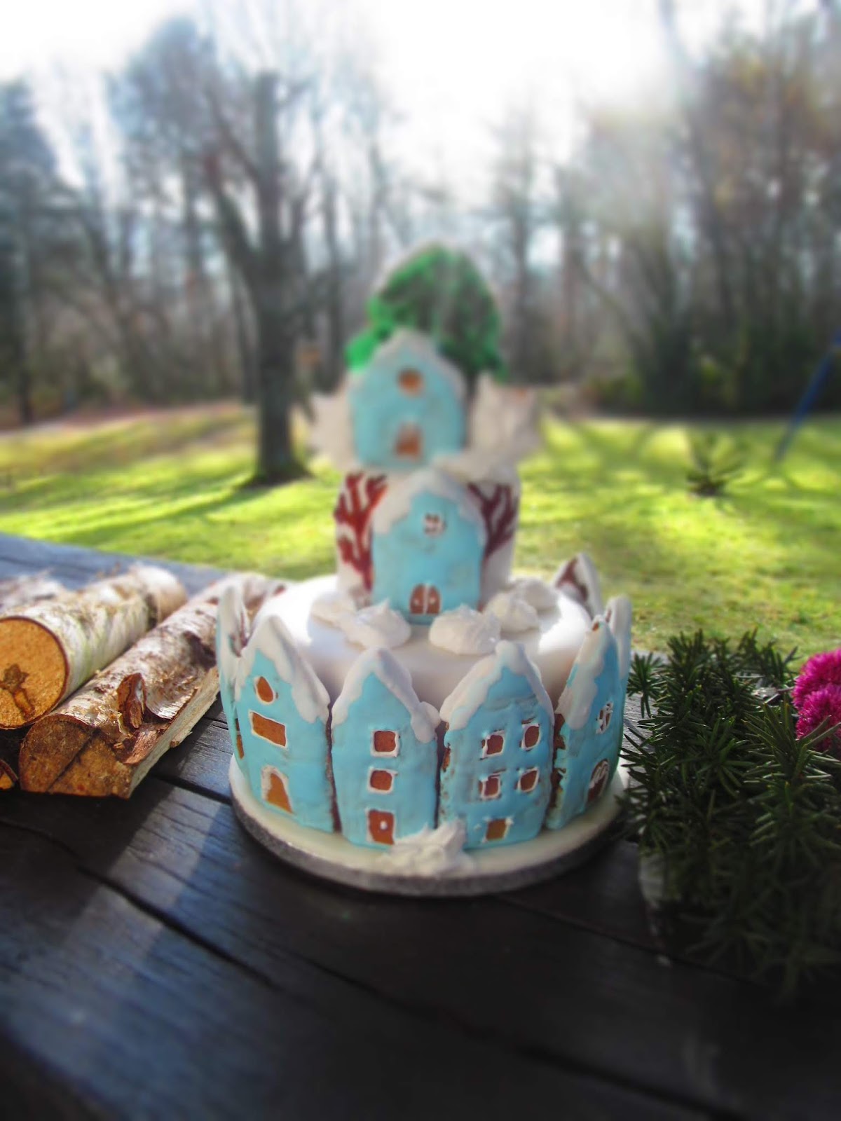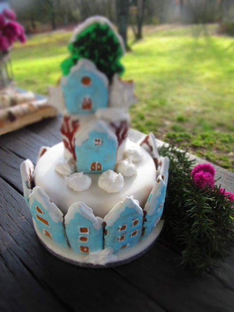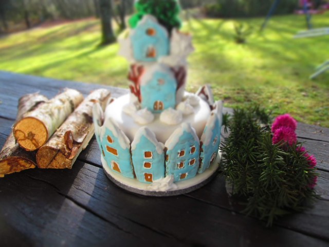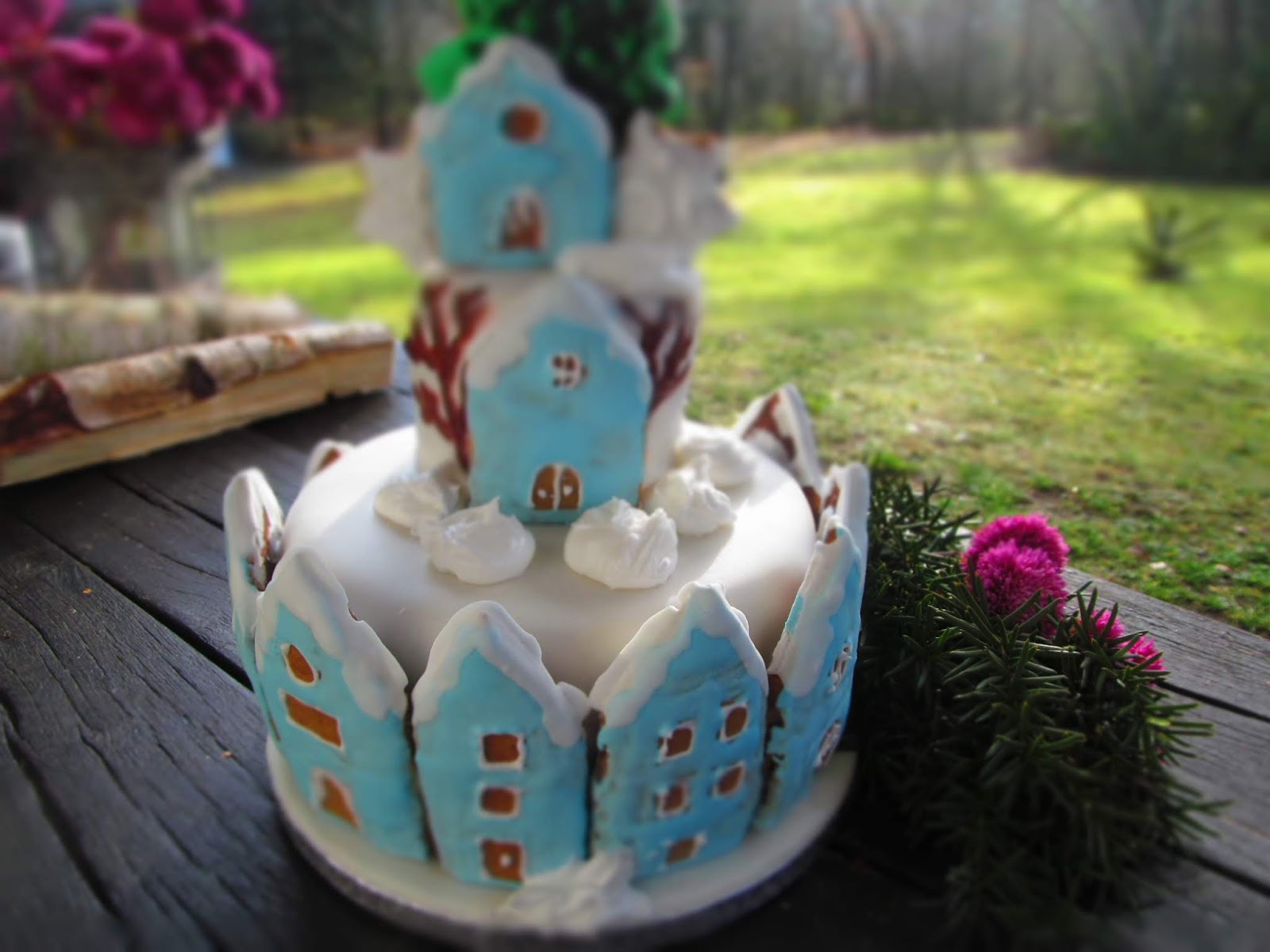 Тортата е направена от блатове с лешникова нуга, крем с лешникова нуга, къщички от меденки и мноооооого захарно тесто и захарна глазура.