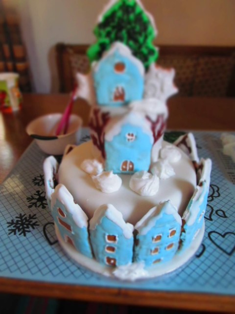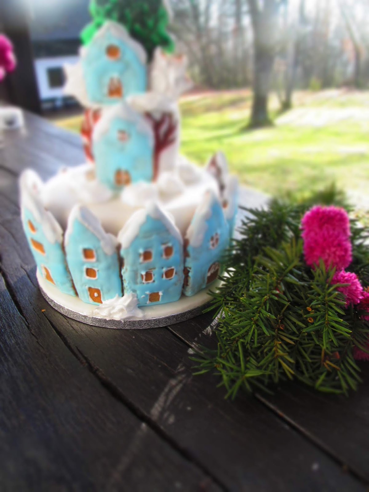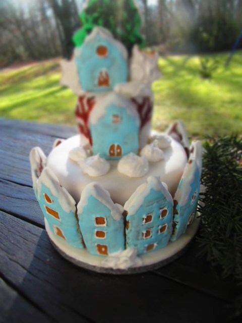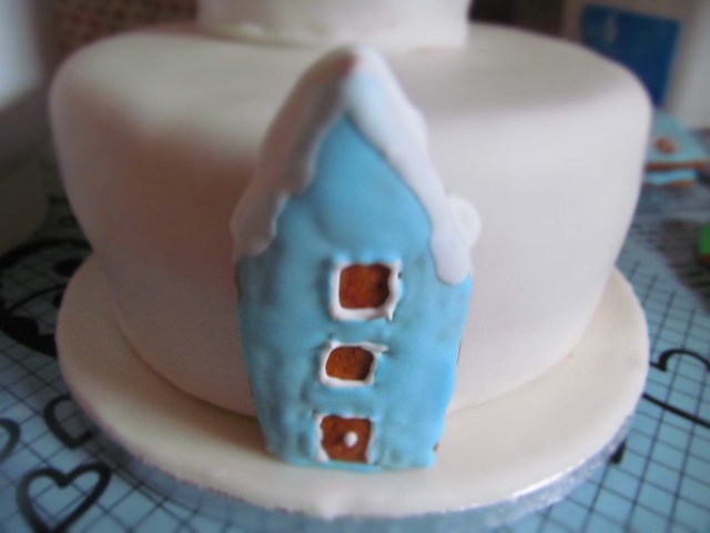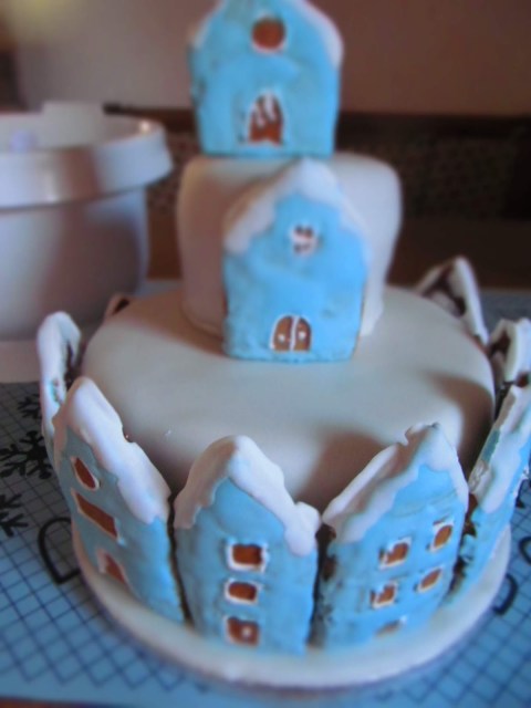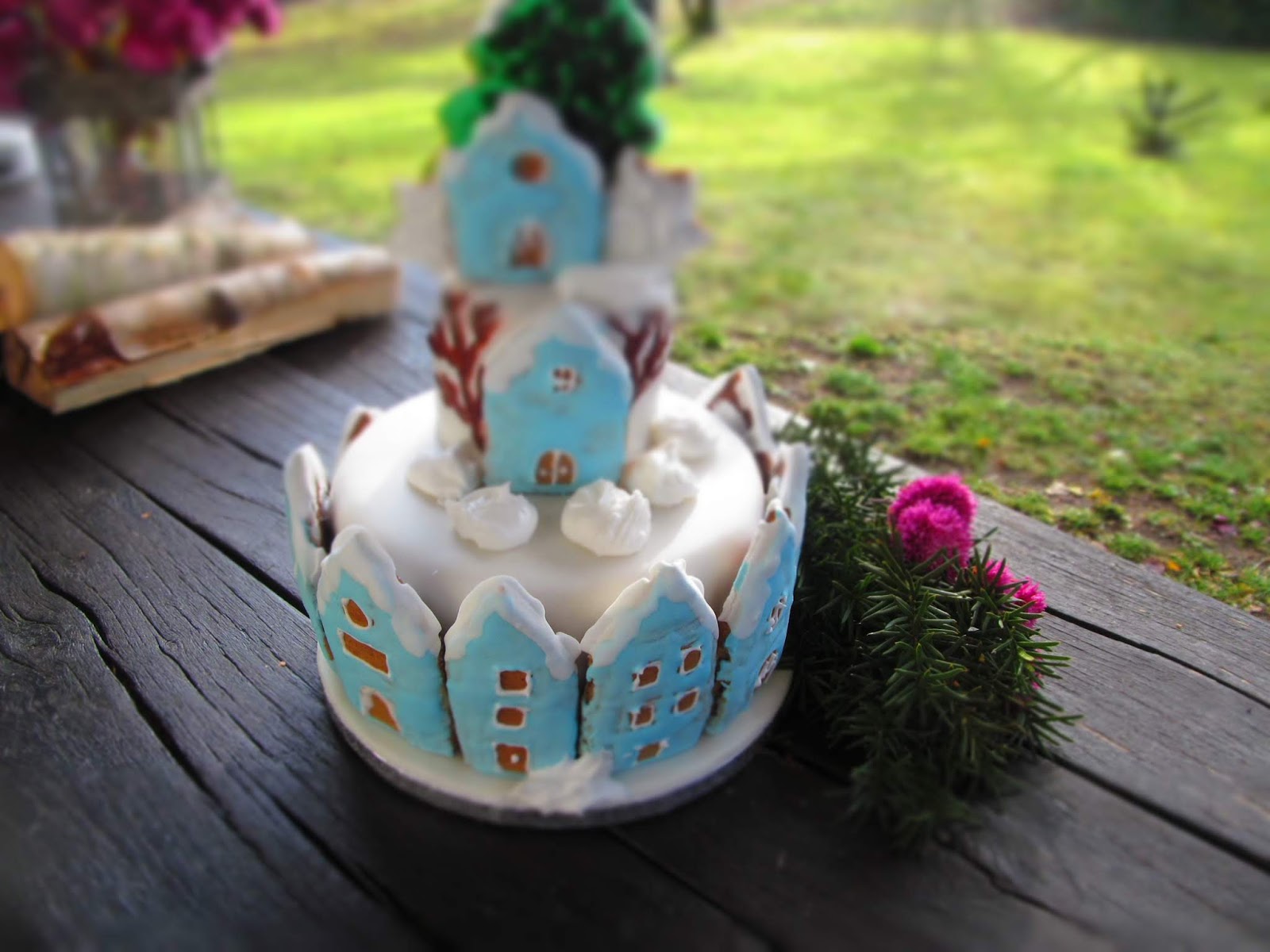Тортата е направена от блатове с лешникова нуга, крем с лешникова нуга, къщички от меденки и мноооооого захарно тесто и захарна глазура.