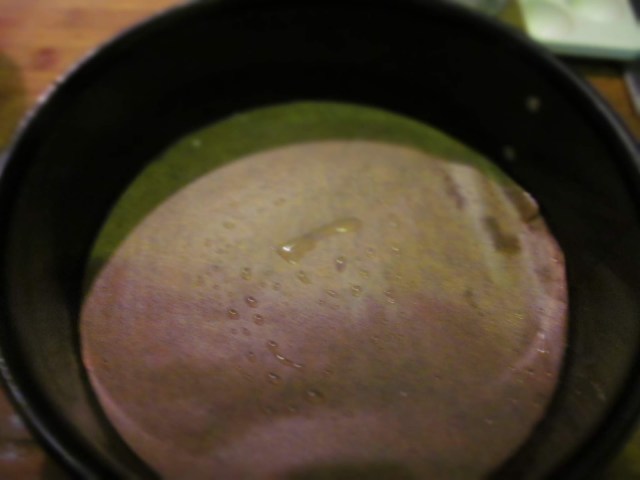 - Изсипвам тестото в предварително подготвената с хартия за печене и намазана с олио 18 сантиметрова форма със свалящи стени.