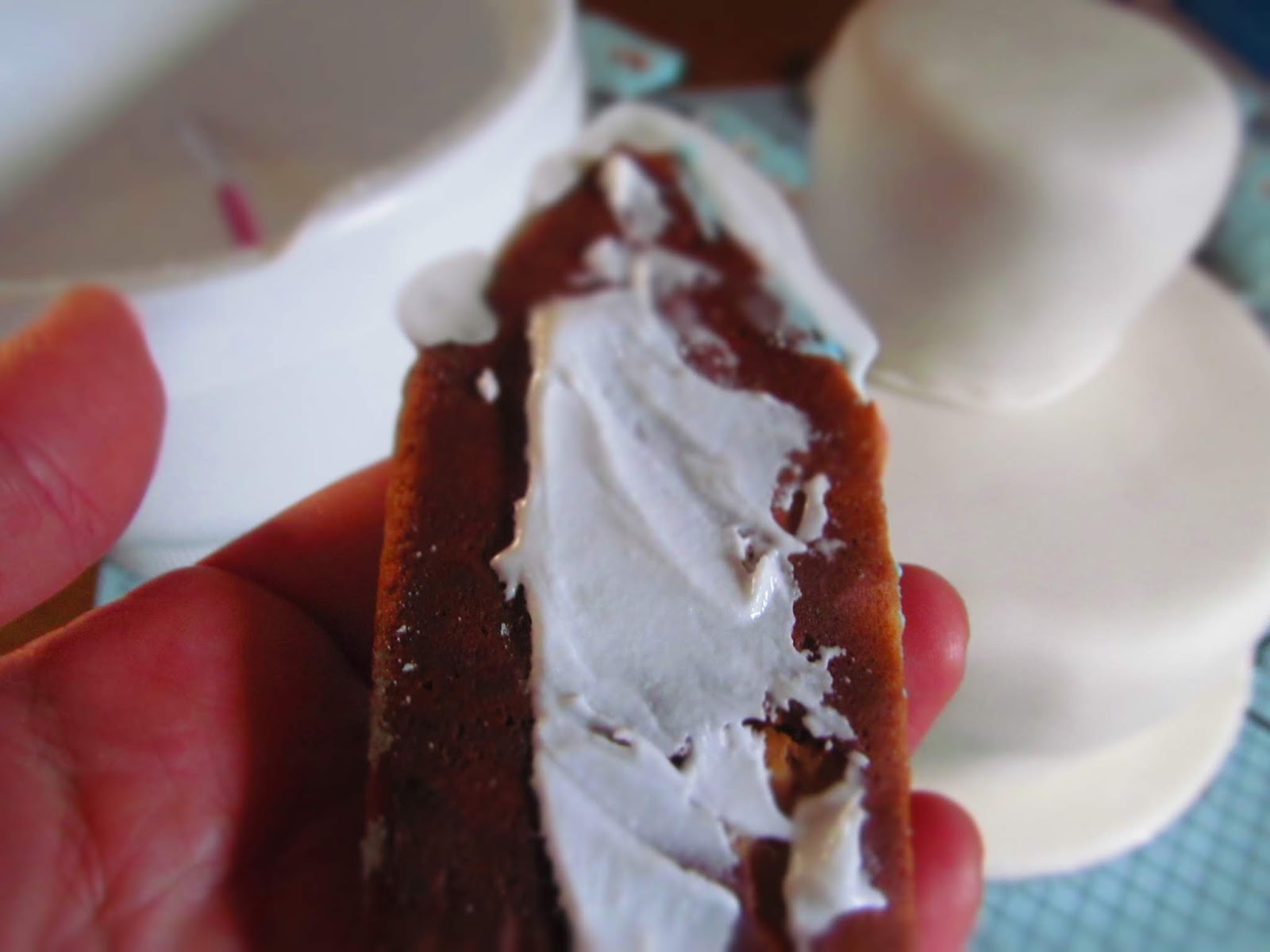- От белтъка, който се старая да е много пресен и пудрата захар правя захарна глазура, с която залепвам меденките – къщички към тортата.