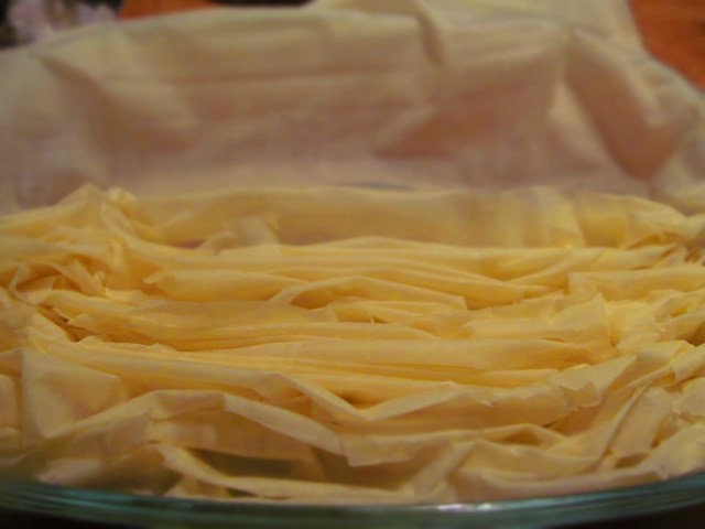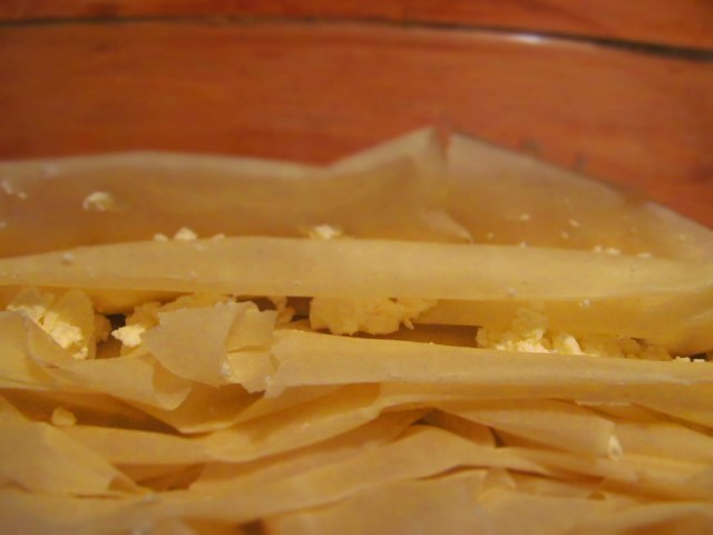 - Започвам да подреждам седемте кори като ги надиплям като хармоника в тавичката.