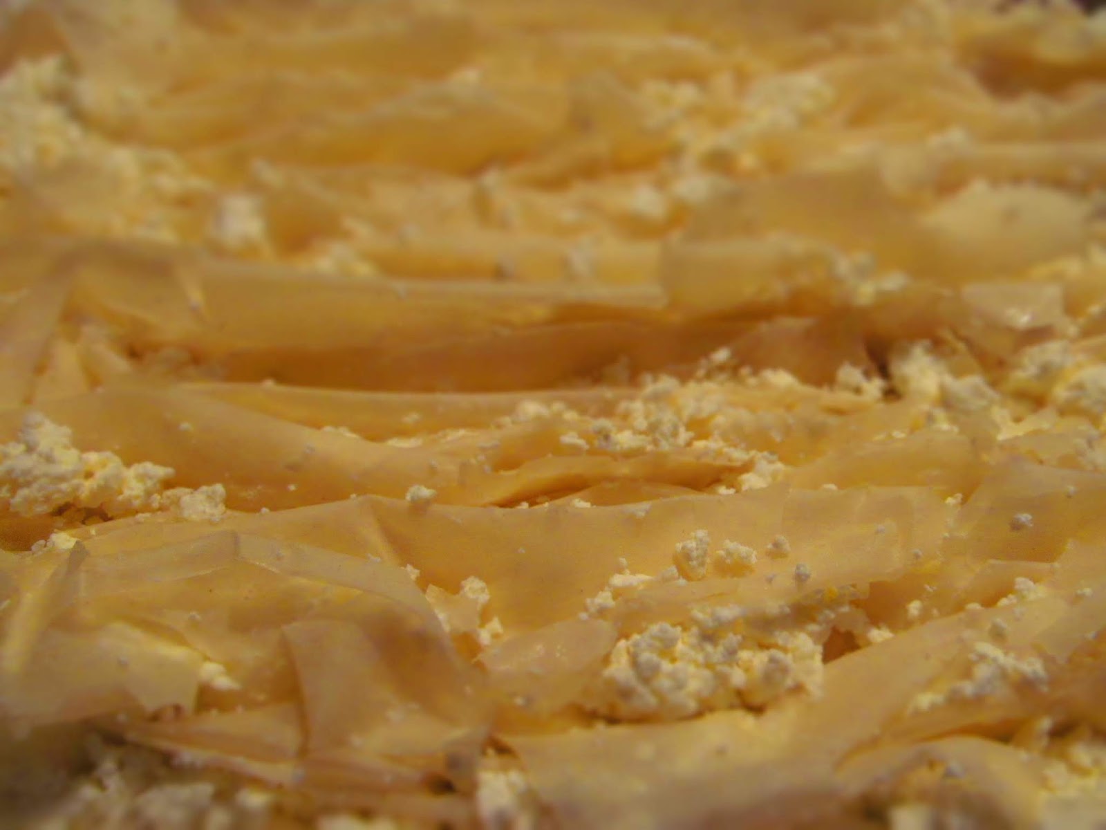 - Наръсвам сирене между хармониките от кори за баница. Разпределям го така, че да има навсякъде.