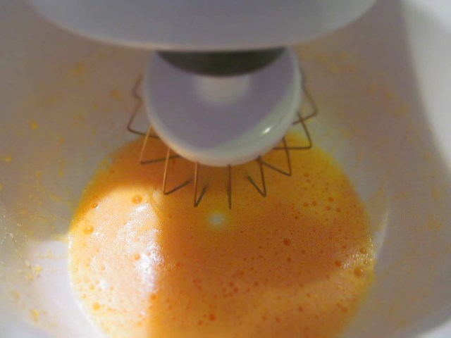 - В купата на миксера чукнах три от яйцата и белтъка на четвъртото.