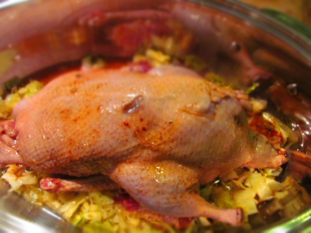- Напълнената патица намазах с червен пипер и поставих в бретера – голям съд с капак за изпичане във фурната. Може да се използва и глинена тенджера.