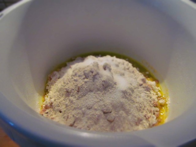 - Добавям 30 гр от сусама и започвам да бъркам с накрайниците за тесто, и да сипвам водата.