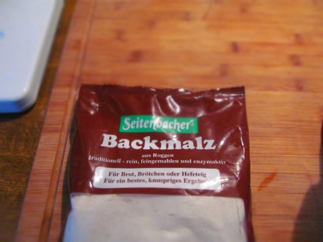 Другото, което добавих към тестото е малц. Оказа се, че в Германия се използва много често при приготвянето на хляб, защото прави хляба мек, пухкав и здравословен. В случая е ечемичен малц за печива. Продава се в Германия на рафтовете за брашно.