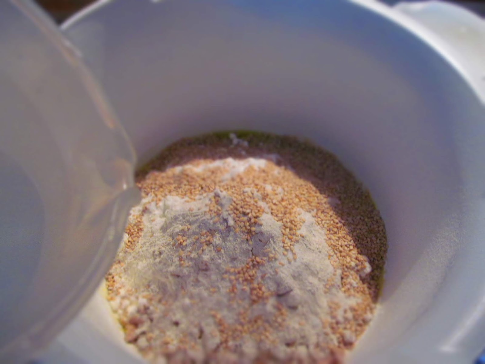 - Добавям 30 гр от сусама и започвам да бъркам с накрайниците за тесто, и да сипвам водата.