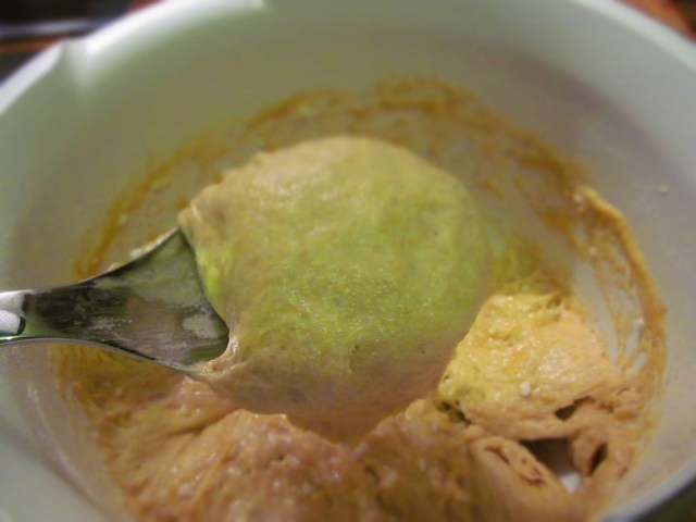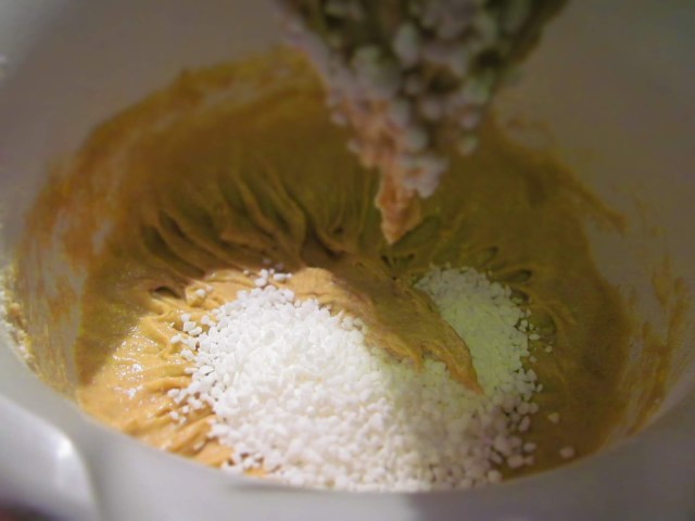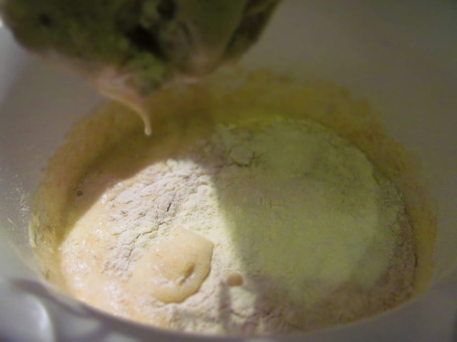 • После изсипах смесените брашна и бърках до гъста и гладка смес.