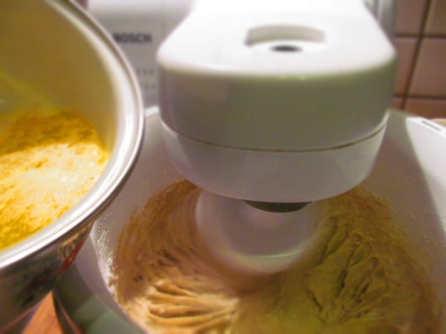 • Към яйцата добавих млякото, с разтворената в него мая.